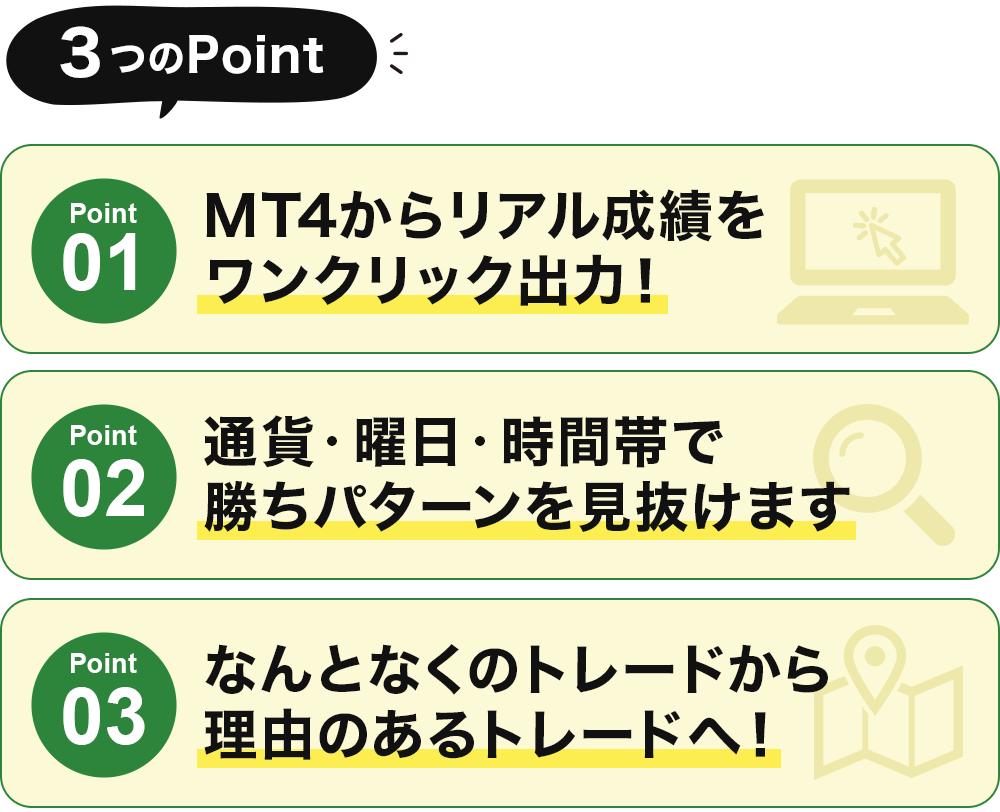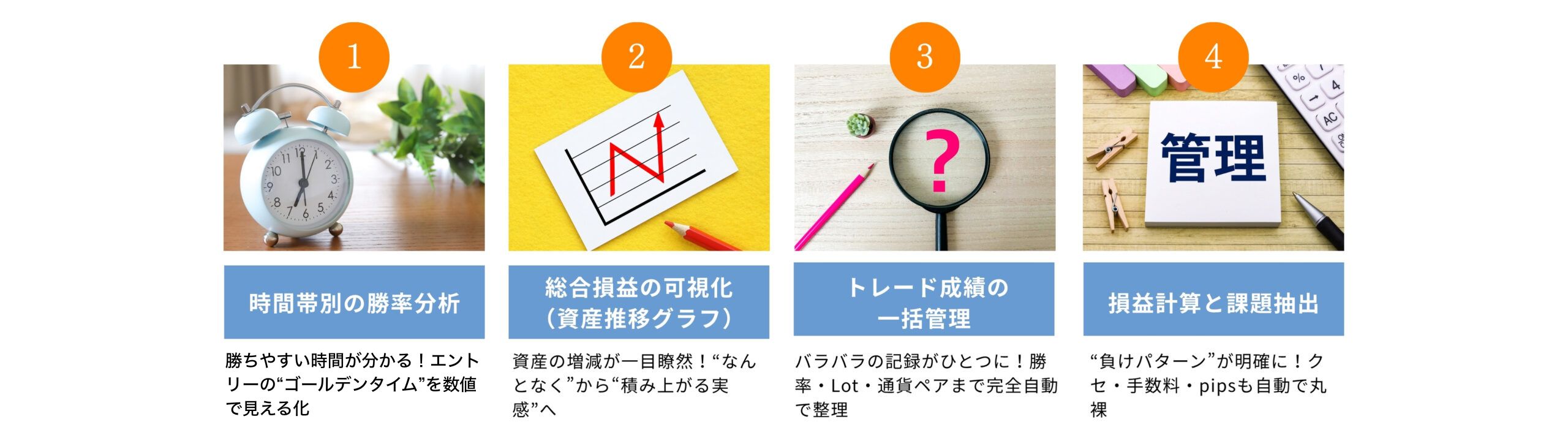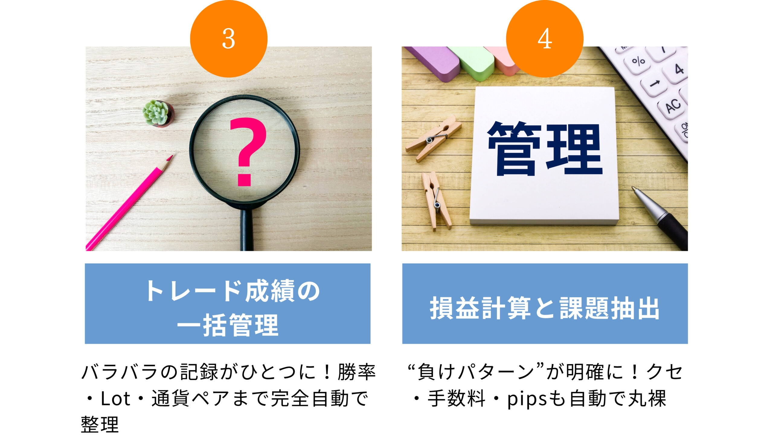 従来ように、手作業で履歴をまとめたり、感覚に頼ってトレードを振り返る必要はありません。