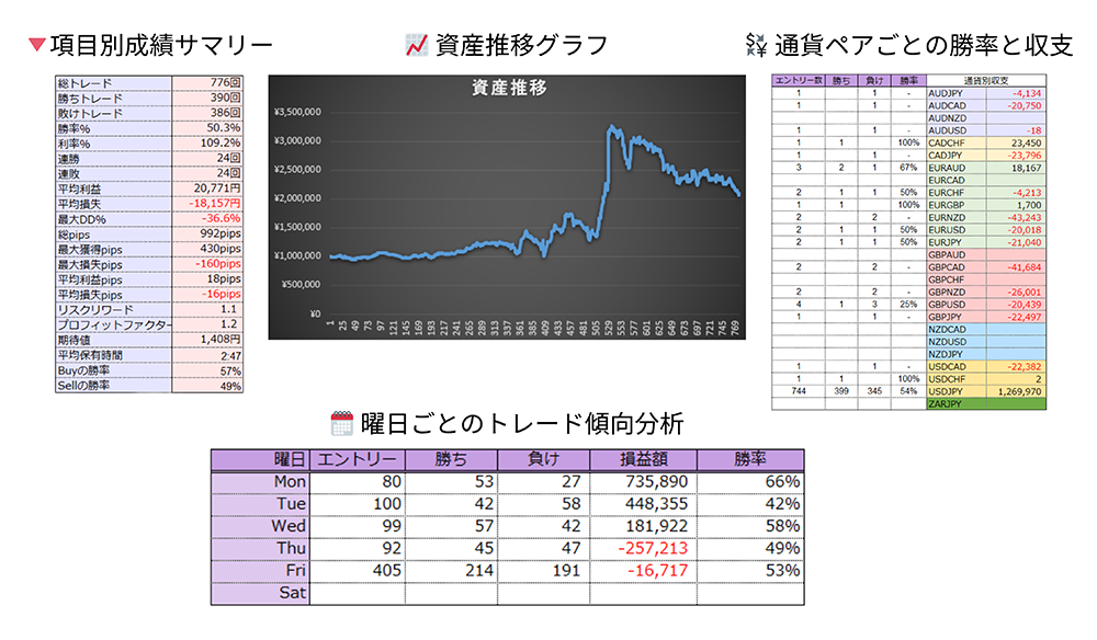 「どの時間帯が得意なのか」「どの通貨ペアが苦手か」などをひと目で可視化して、自分の“勝ちパターン”を把握することが可能です。