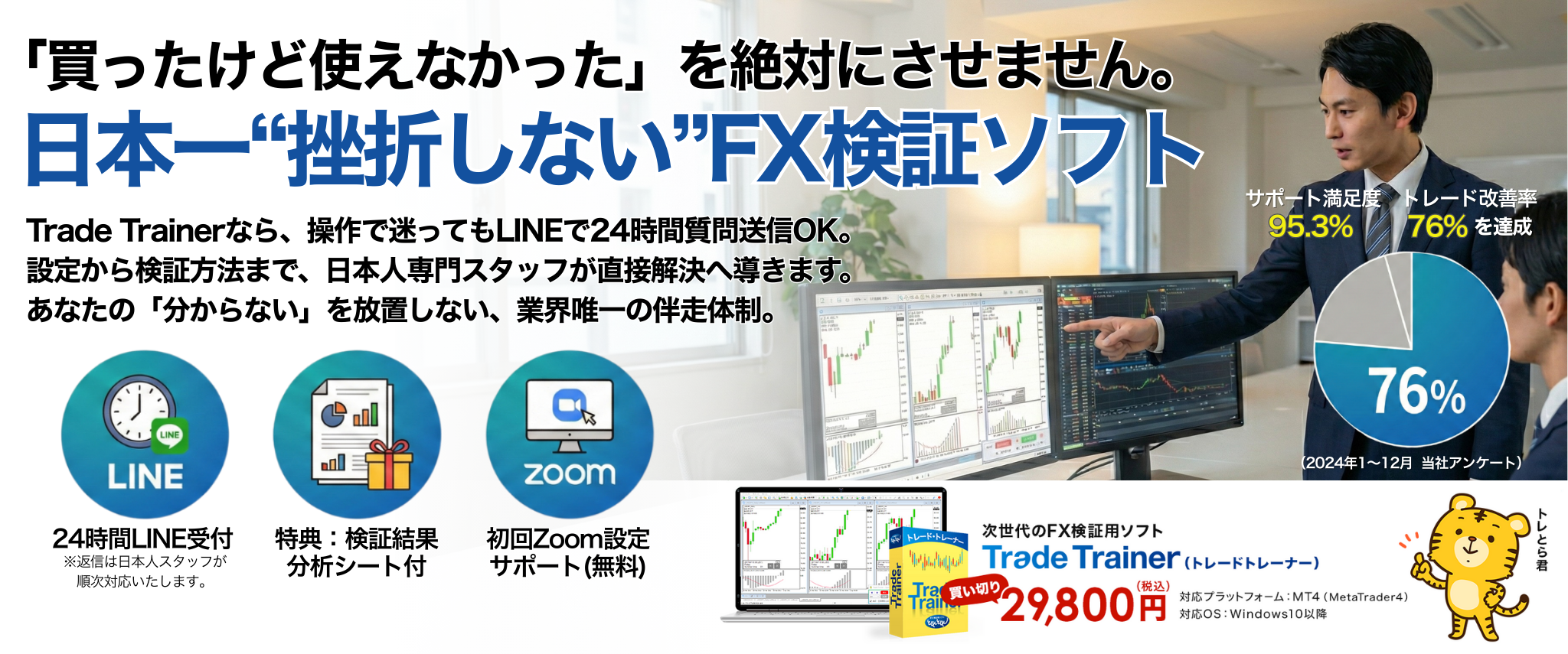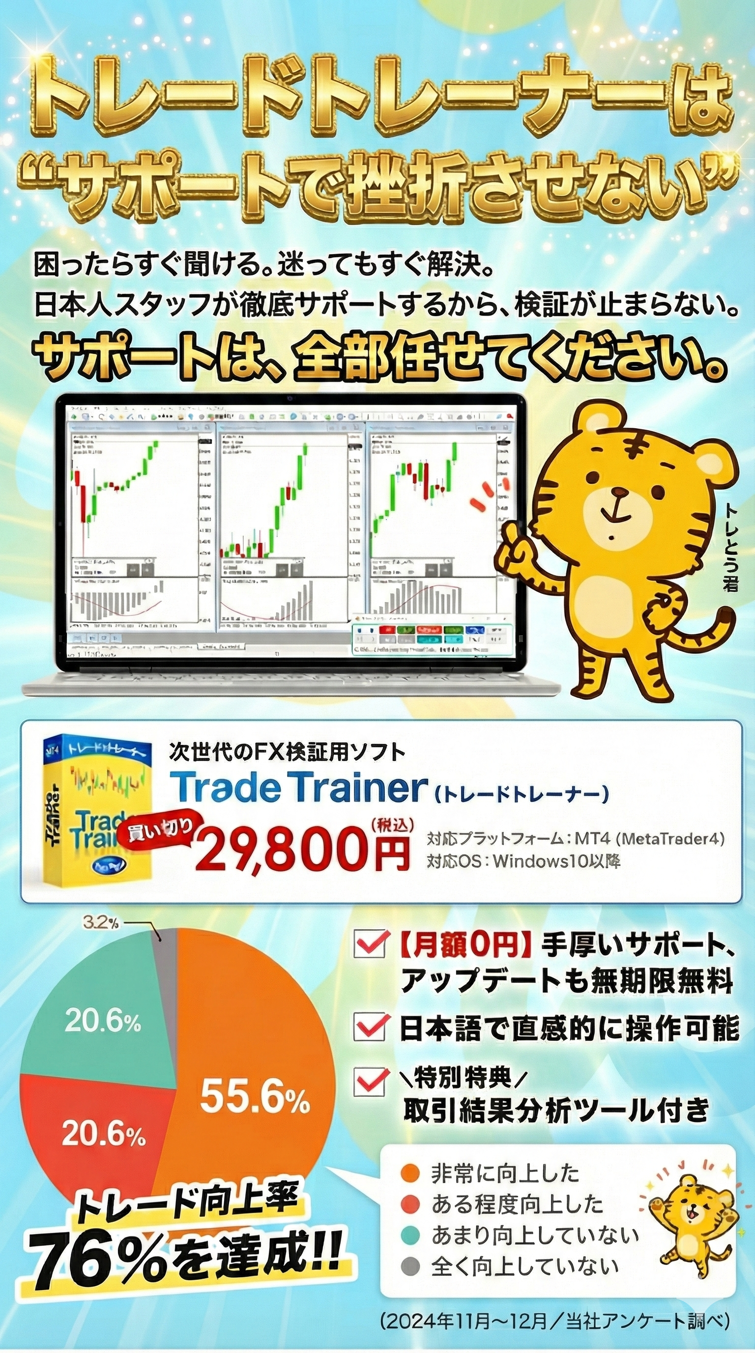Trade Trainer(トレードトレーナー)は、FXを行うすべての方が損をしない投資を行えるようになるためのFX検証用ソフトです。